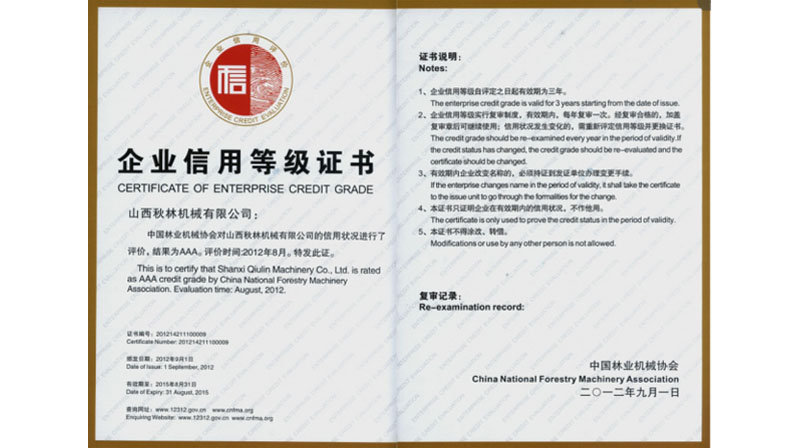 獲中國林業機械協會頒發的AAA級企業信用等級證書